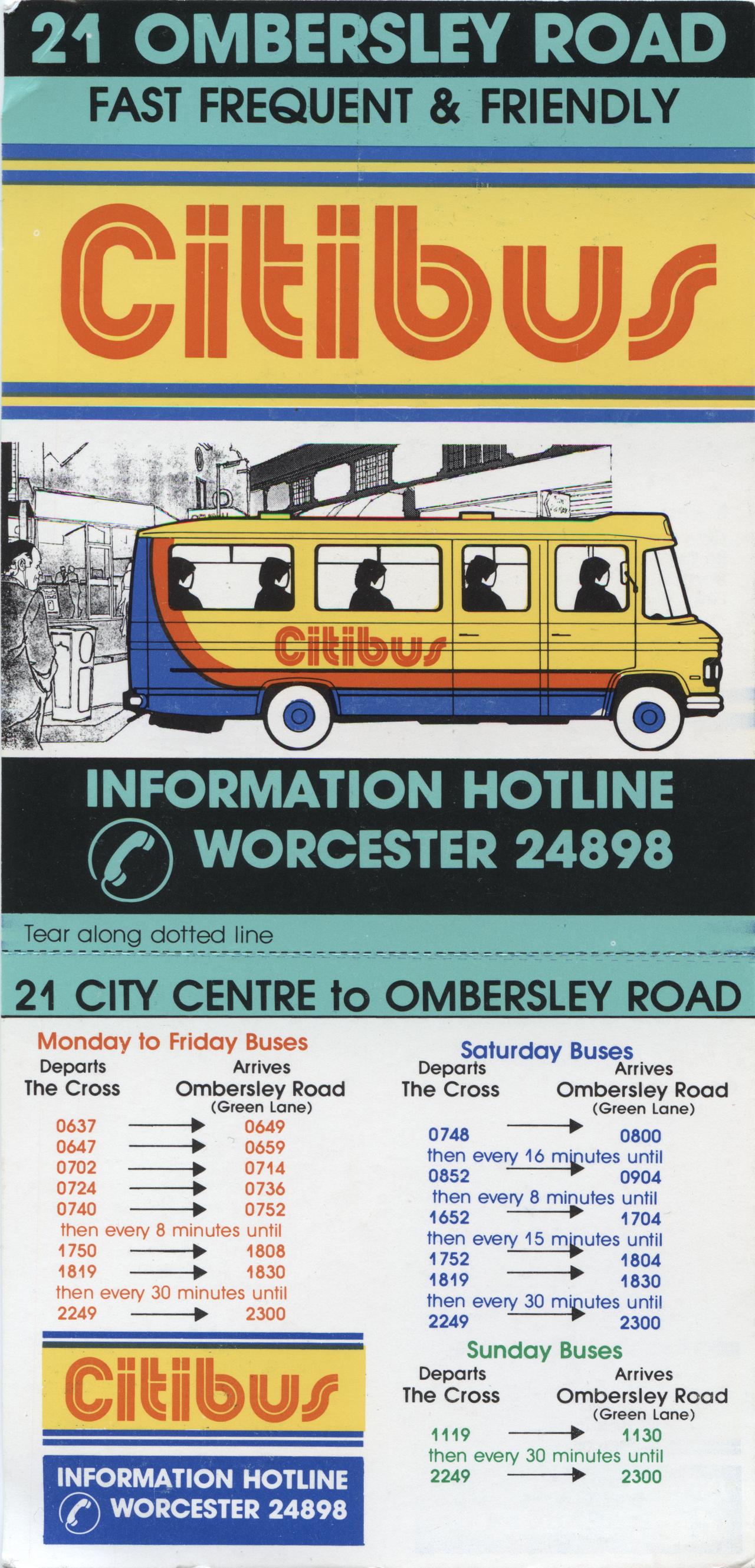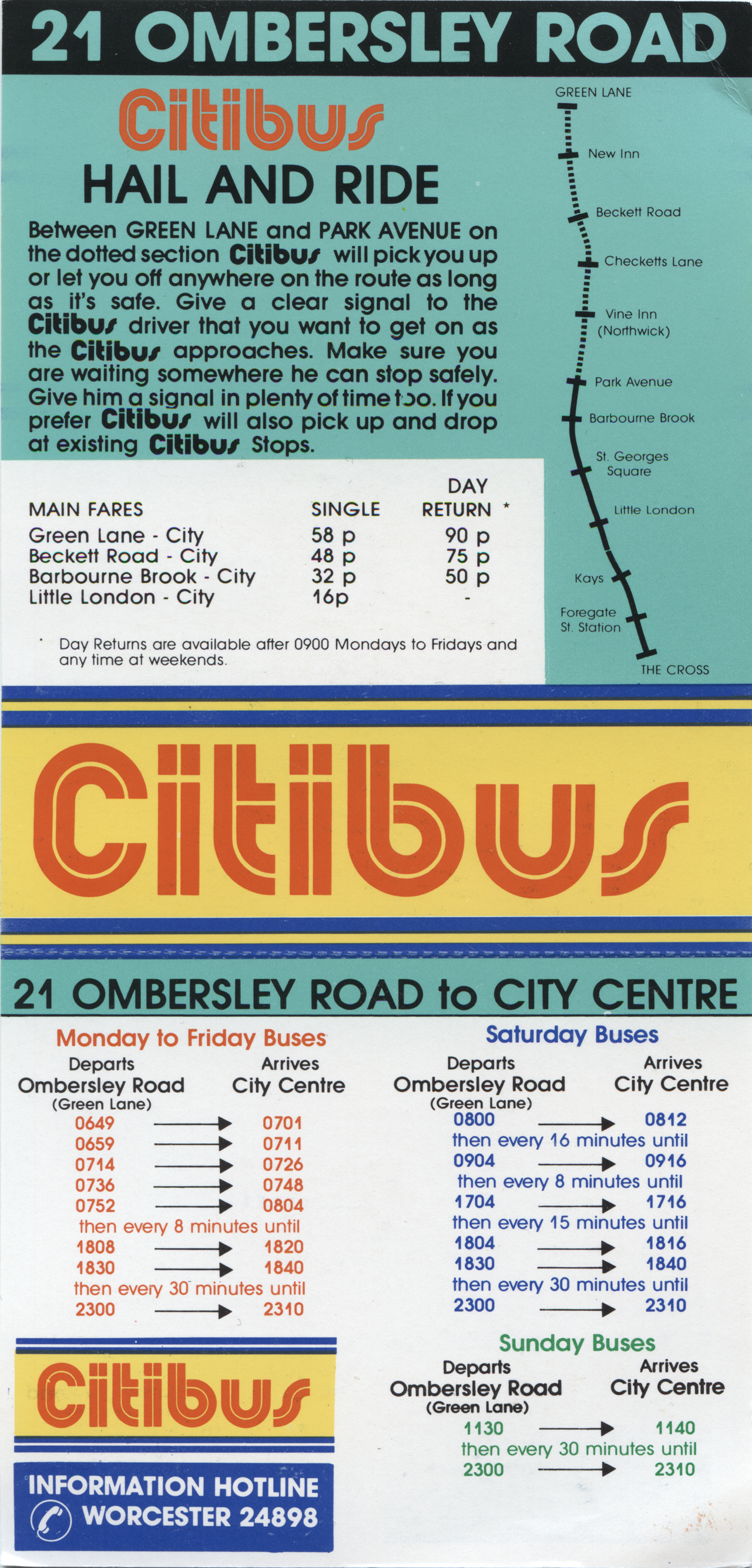 Worcester Citibus Service 21 information card. Not dated but believed to be from Saturday 23rd November 1985 when the Citibus Network was introduced.